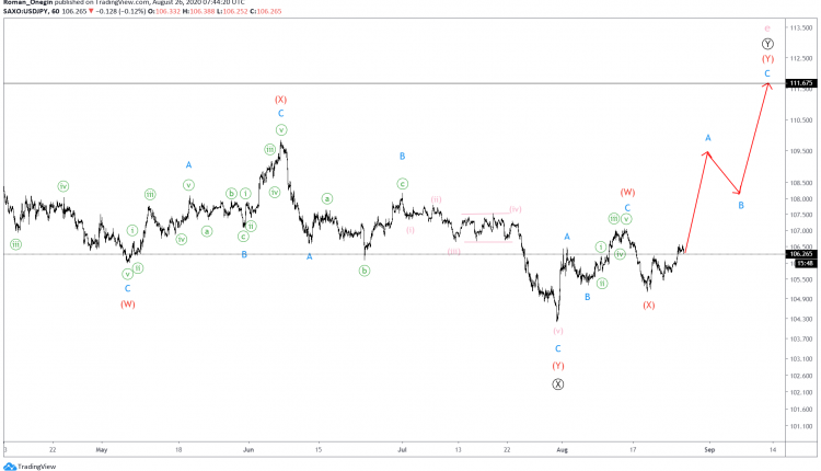 The USDJPY structure shows a corrective move, consisting of primary sub-waves Ⓦ-Ⓧ-Ⓨ. The ‘three’ wave pattern takes the form of a double zigzag.