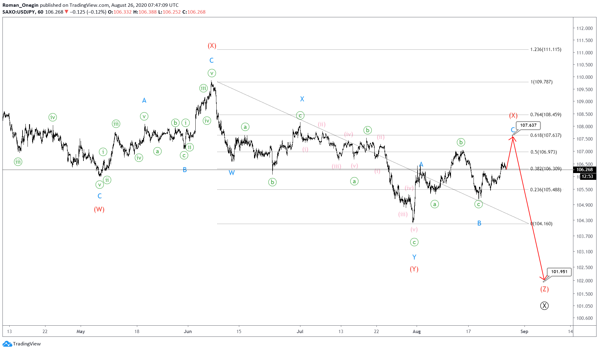 In this case, in the near future, the market could move up in wave C. This should complete the intervening wave (X) near 107.63. At that level, wave (X) will be at 61.8% of wave (Y).