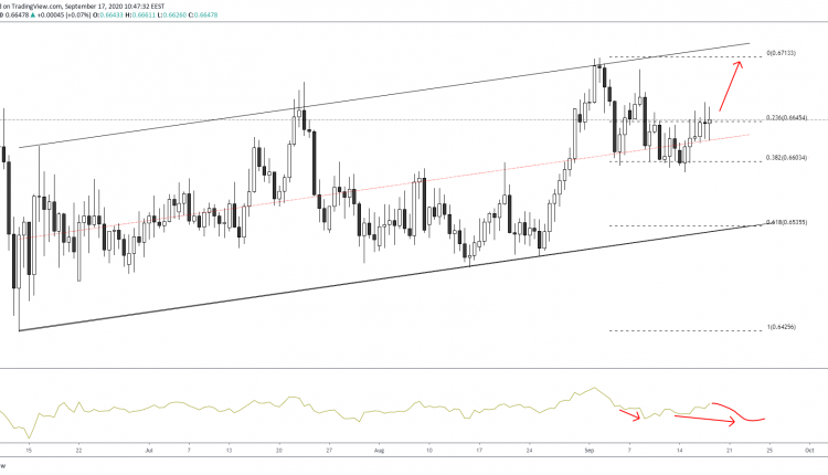 Since then, we have witnessed several attempts to break the upper line. The lower channel has also been tested as prices move away from the psychological 0.65 area.