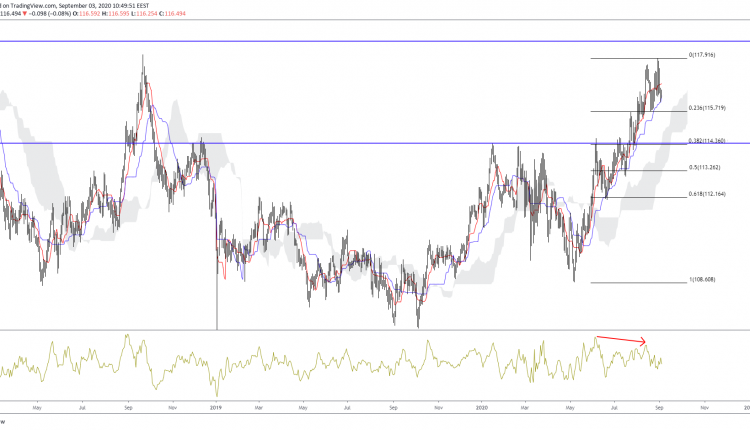 The double divergence on the momentum indicator hints to a move towards the 23.6% Fibonacci retracement line. A hold at 115.72 would indicate a false break. However, a break towards 38.2% could support further declines to the market low at 108.60.