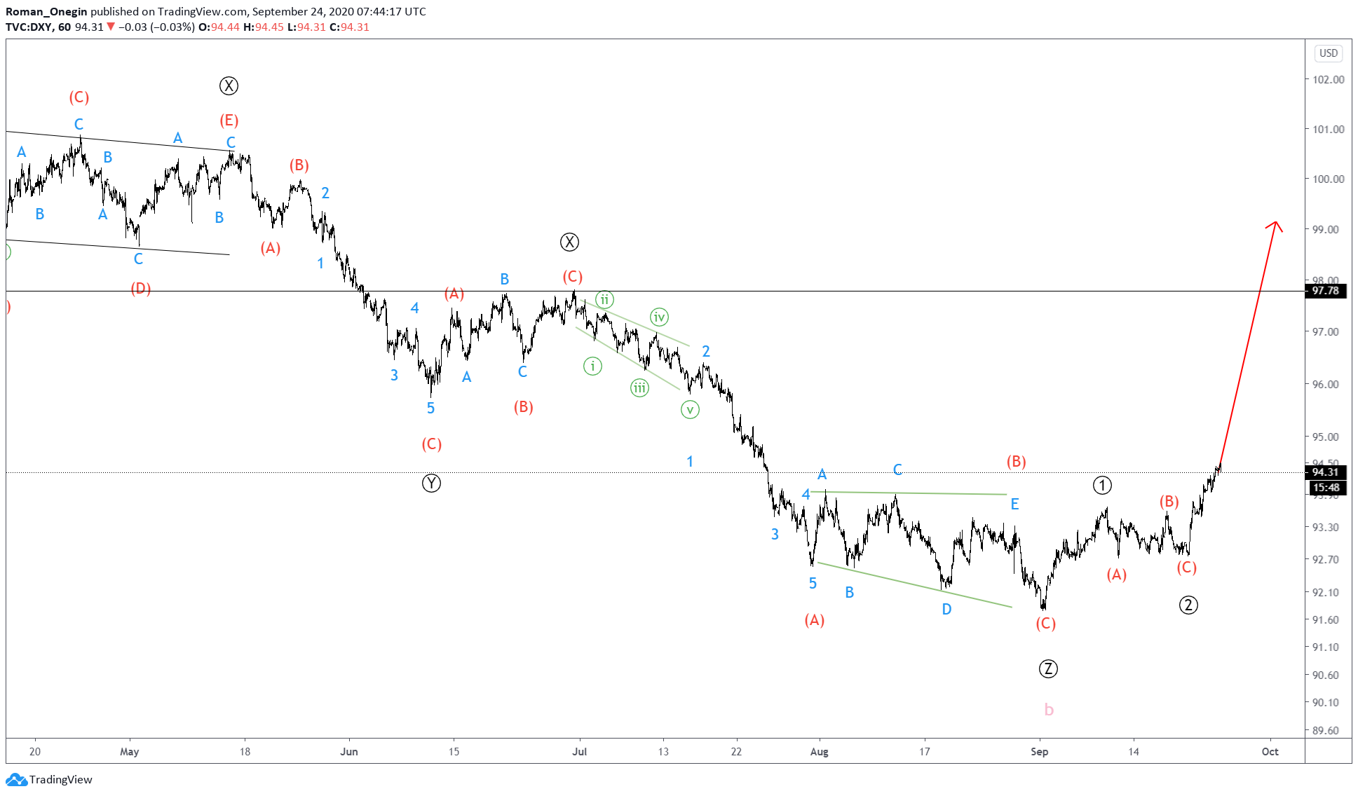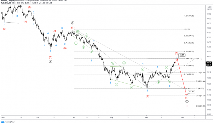 The DXY shows a bearish triple zigzag formation consisting of sub-waves Ⓦ-Ⓧ-Ⓨ-Ⓧ-Ⓩ.