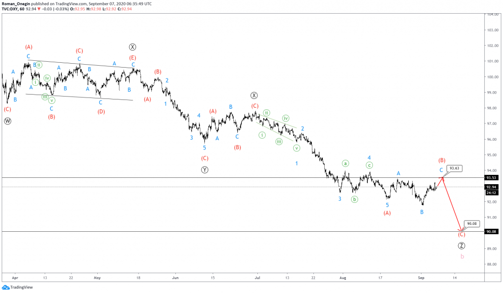 The current DXY structure hints at a triple zigzag pattern consisting of sub-waves Ⓦ-Ⓧ-Ⓨ-Ⓧ-Ⓩ. All waves are simple zigzags.