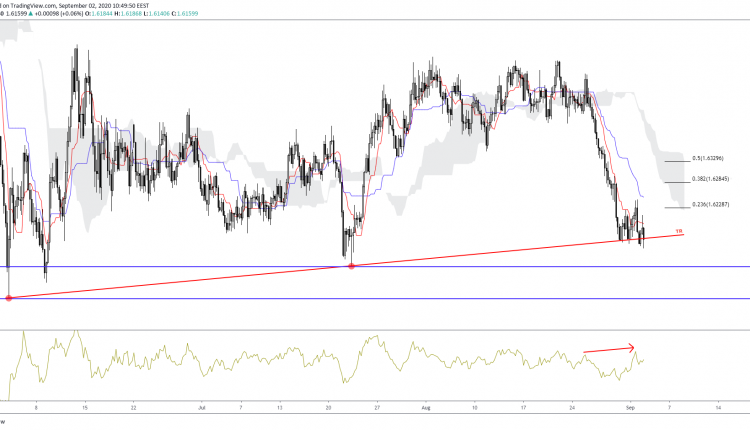 The first target would be the 1.61 range and then the main support level at 1.6029. With prices far away from the Ichimoku cloud and trading below the Tenkan and Kijun lines, further downside is likely.