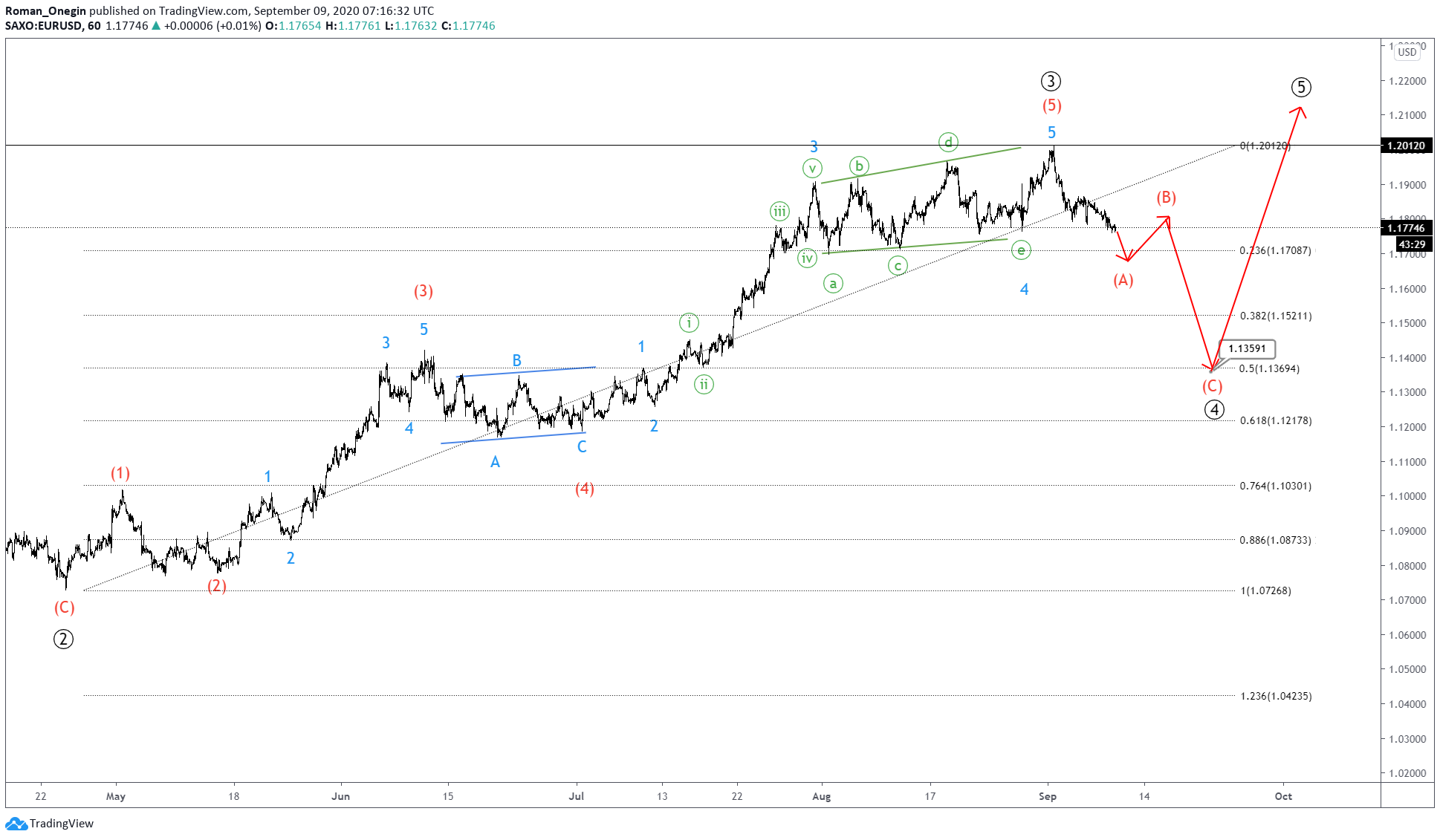 EURUSD can then start to rise in wave ⑤ above the previous maximum.