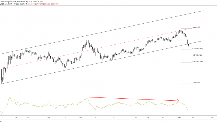 The current price is now acting as a support to a previous resistance level at 136.69. The bearish divergence on the momentum indicator triggered a downside move starting at the median regression to the lower ascending channel.