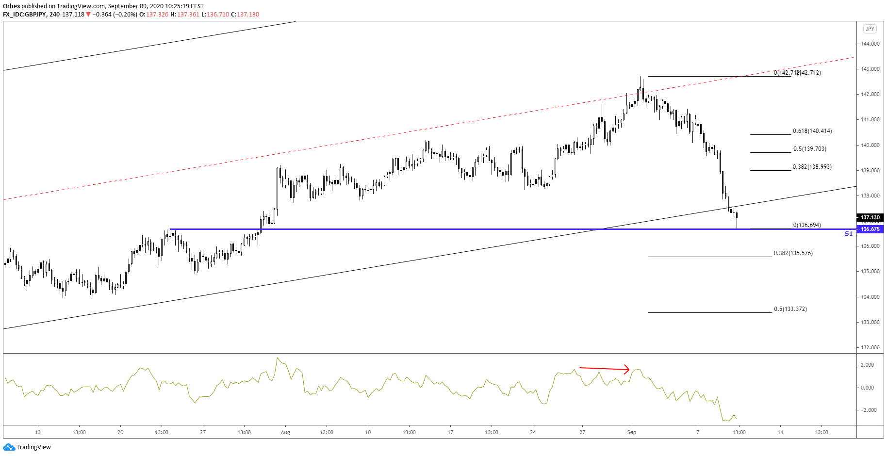 An ascending channel created from March has seen a test at the upper region. However, since then a bearish divergence on the momentum indicator has triggered a move towards 38.2% of the 124.03/142.71 Fibonacci leg.