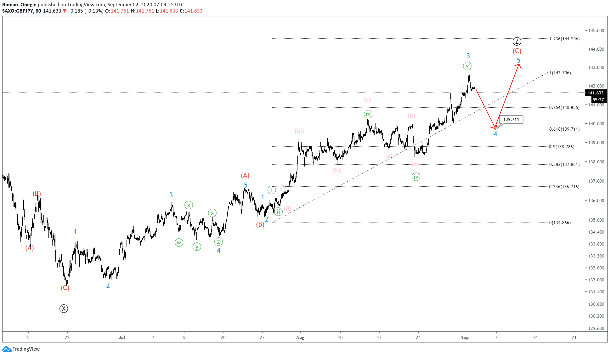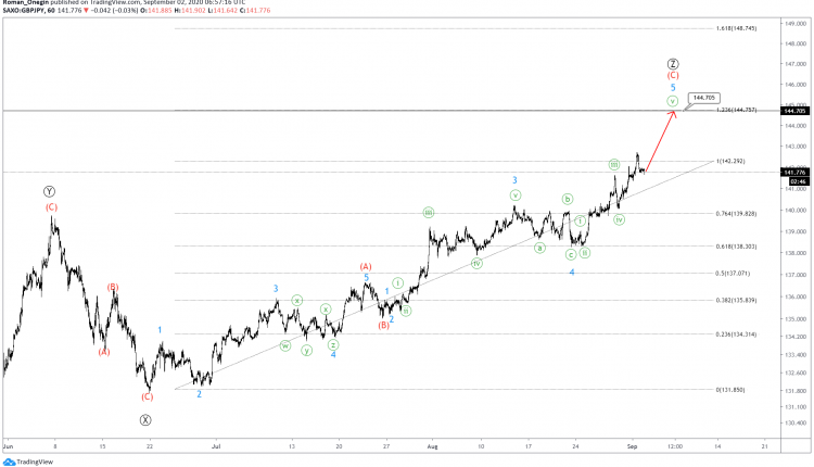 We expect a move in the 5th wave near 144.70. At that level, wave Ⓩ will be at 123.6% of wave Ⓨ.