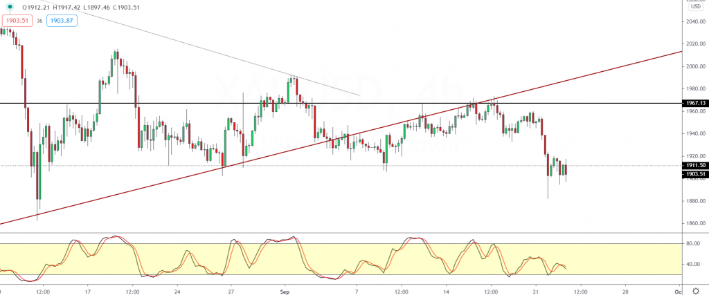 After briefly slipping past the 1900 level, gold is back near the 1900 region.