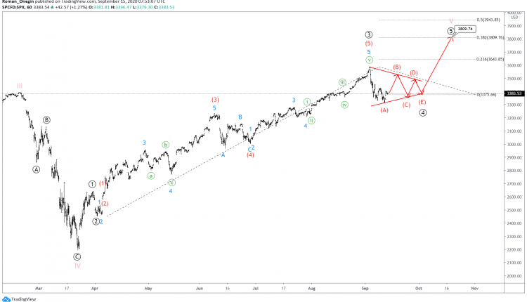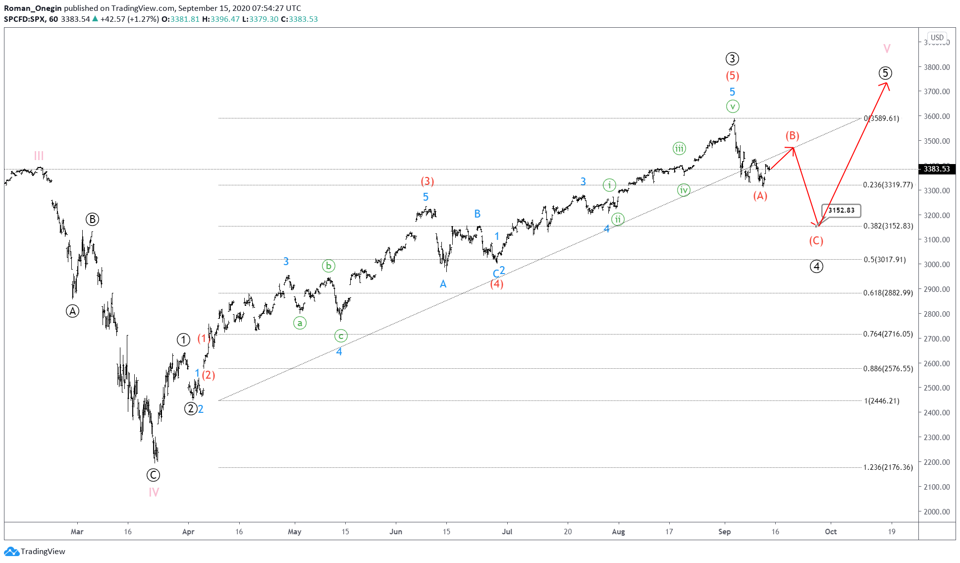 After the completion of an intermediate correction, prices could go down to impulse (C) near 3152.83. At that level, correction ④ will be at 38.2% of impulse wave ③.
