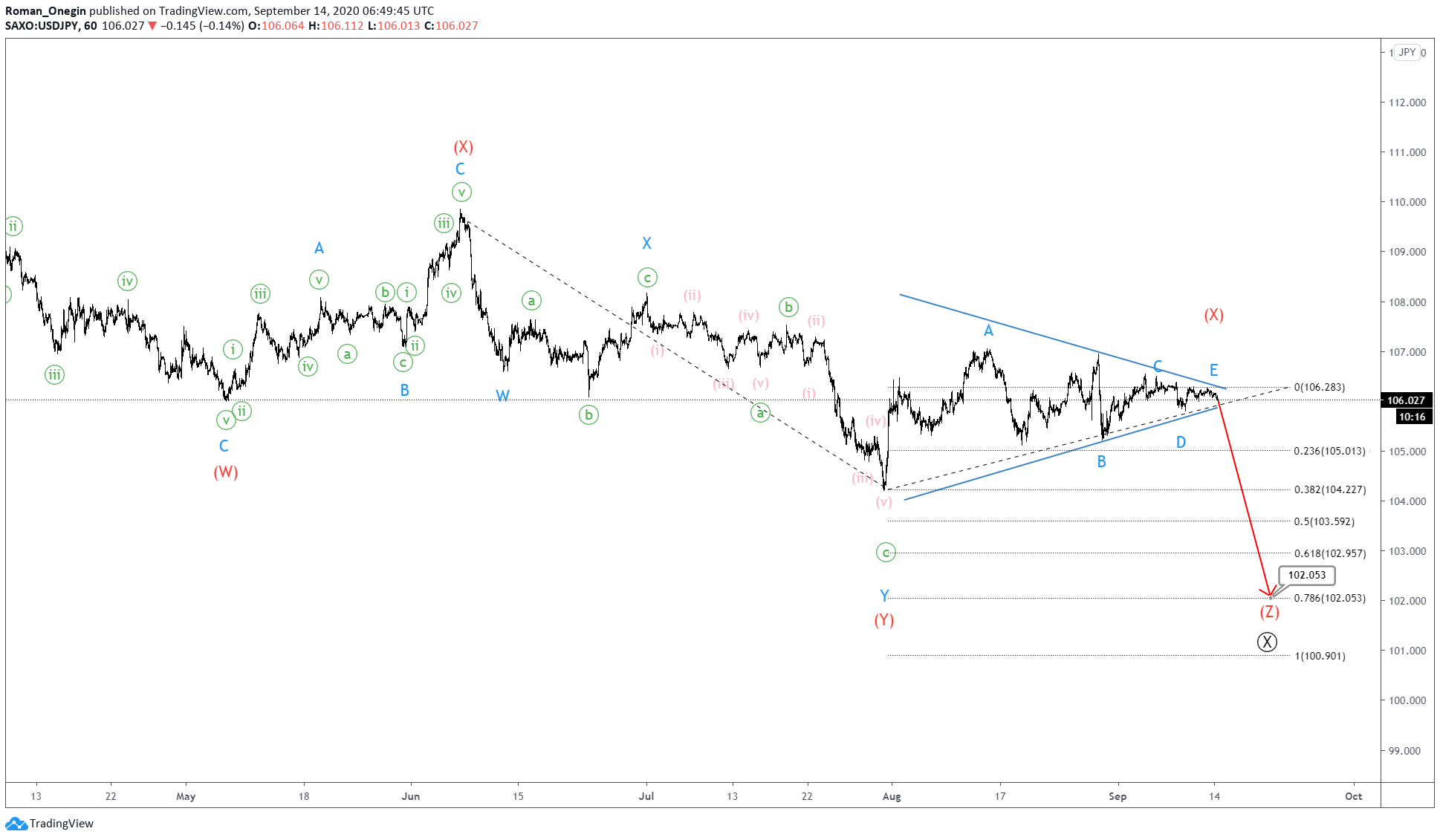 In this case we see the construction of intermediate sub-waves (W)-(X)-(Y). Intervening wave (X) with minor sub-waves A-B-C-D-E is fully completed.