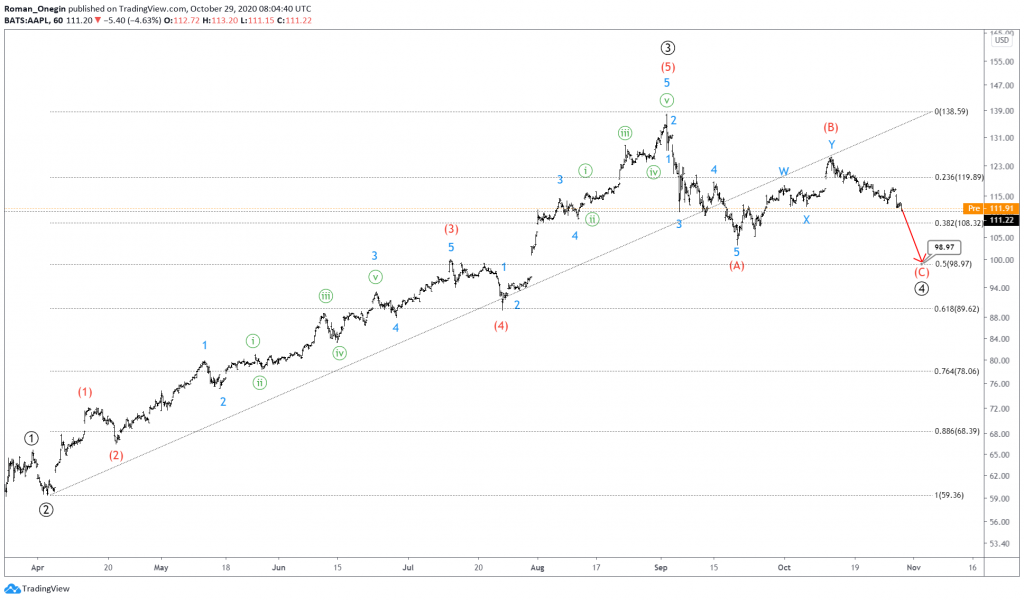 AAPL hints at a bullish impulse consisting of primary sub-waves ①-②-③-④-⑤. The first three waves are fully completed, whereas bearish correction wave ④ is still under development.