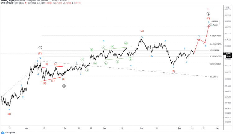 AUDUSD continues to form a corrective triple zigzag wave b of the primary degree.