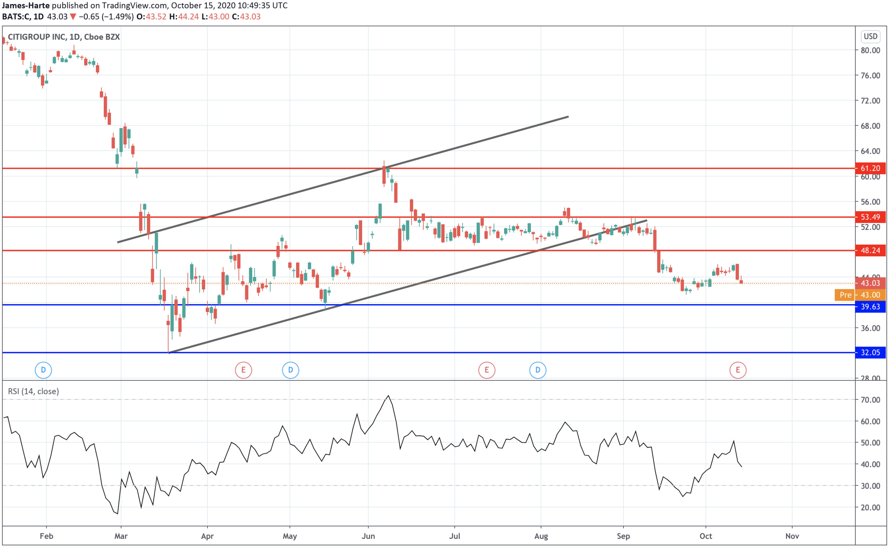 Following the breakdown below the rising channel which had framed the recovery off year to date lows, Citi shares had started to recover over the last fortnight.
