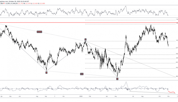 Bears could be eying the 121 handle next as it marks the 78.6% FR of CD. However, a deeper decline would form better opportunities for bulls not only from a price perspective but also from an indicator standpoint as a more effective hidden divergence could ensue at lower levels.