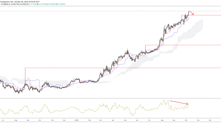 The bearish divergence previously witnessed is now more accentuated as the Ichimoku cloud edges closer. The €9.20 level will be closely followed by €9.10 if bears become more apparent.