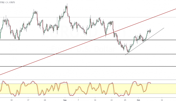 The lower support level at 1.1715 is likely to keep prices from falling further. Watch the minor rising trendline. If this is breached, it could signal a move lower below 1.1715 and likely push the euro toward 1.1600.