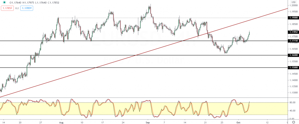 The gains come as the EURUSD has managed to consolidate above the 1.1715 level of support. This could potentially keep the gains with the EURUSD likely to rise further.