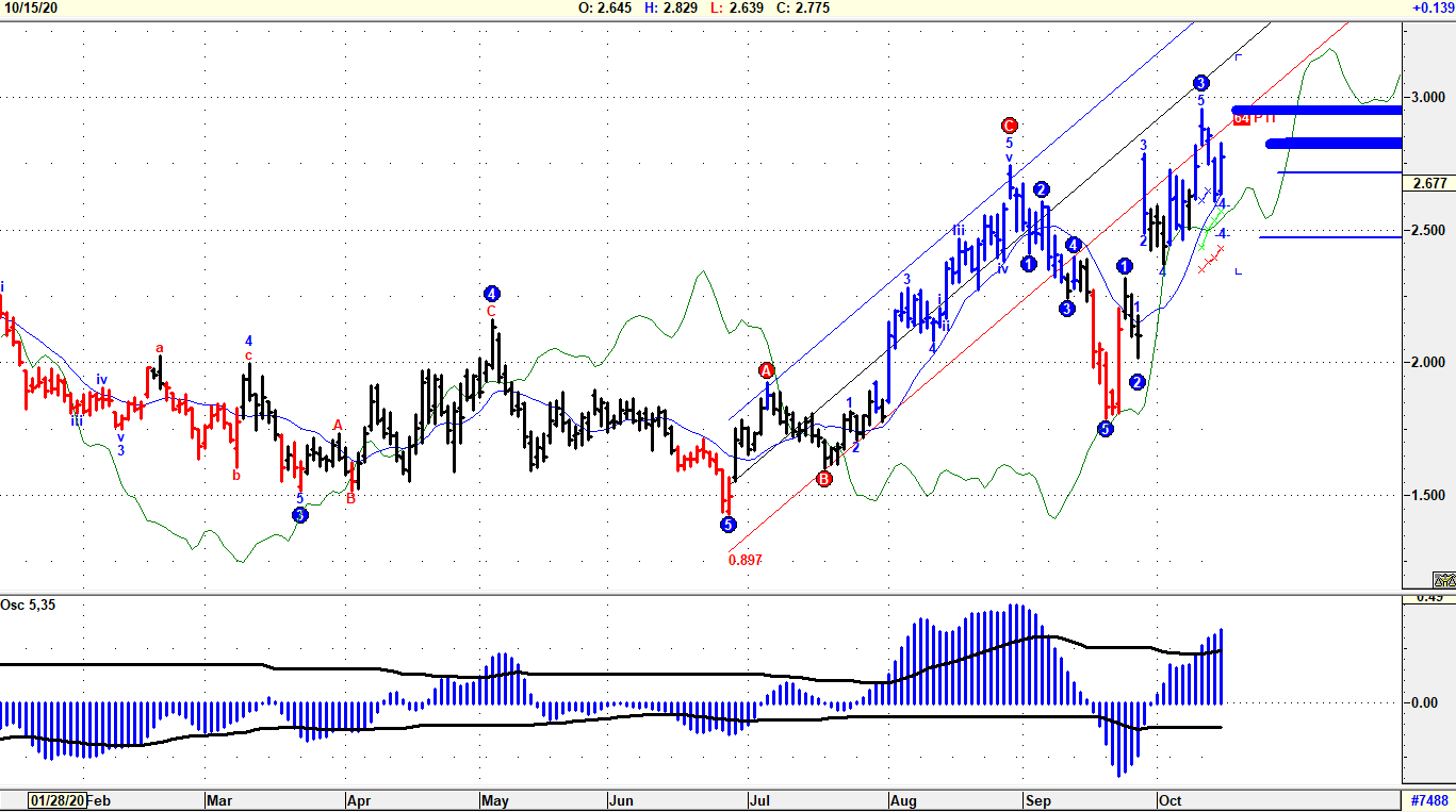 Come si scriveva nel report precedente, le quotazioni del Natural Gas hanno testato una importante resistenza stimata in area 2.65 ed intercettata su 2 STDV sopra la retta di regressione originata sui minimi dello scorso giugno a 1.432, seguita da una correzione veloce per poi manifestare il riattacco alla resistenza suddetta con test più profondo in area 3 dollari. L’aggressione rialzista su quota 2,65 ha dato nuovo boost alle quotazioni configurando Onda 3 di una sequenza impulsiva che dovrebbe portare il Natural Gas su nuovi massimi di periodo una volta drenati gli eccessi. Il momentum a breve termine è letto in negativo. In area 2.65 si gioca quindi la partita, i cui risvolti operativi decreteranno la direzionalità sul breve periodo.