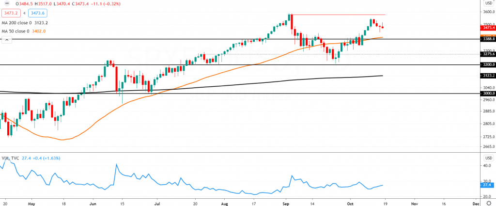 Following the gains from the week before, the S&P500 briefly rose to a one-month high before giving back the gains. The reversal also comes a few points shy of the all-time high near 3589 level.