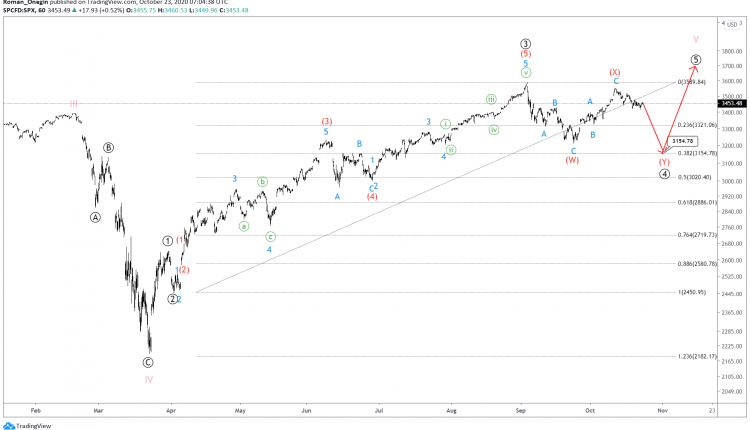 Horizontal correction wave ④, which is currently being formed is a double three (W)-(X)-(Y). Waves (W) and (X) ended, whereas wave (Y) is under development.