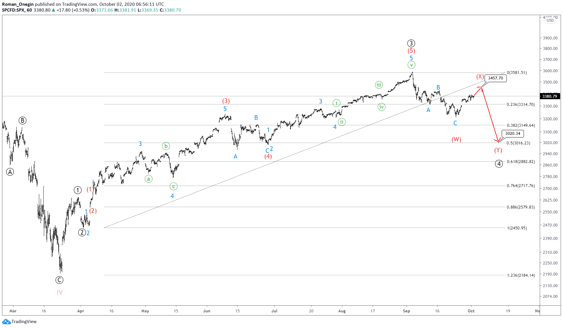 Currently, only the intermediate wave (W) is fully complete. We can also see the development of intervening wave (X) to the 3457 area.