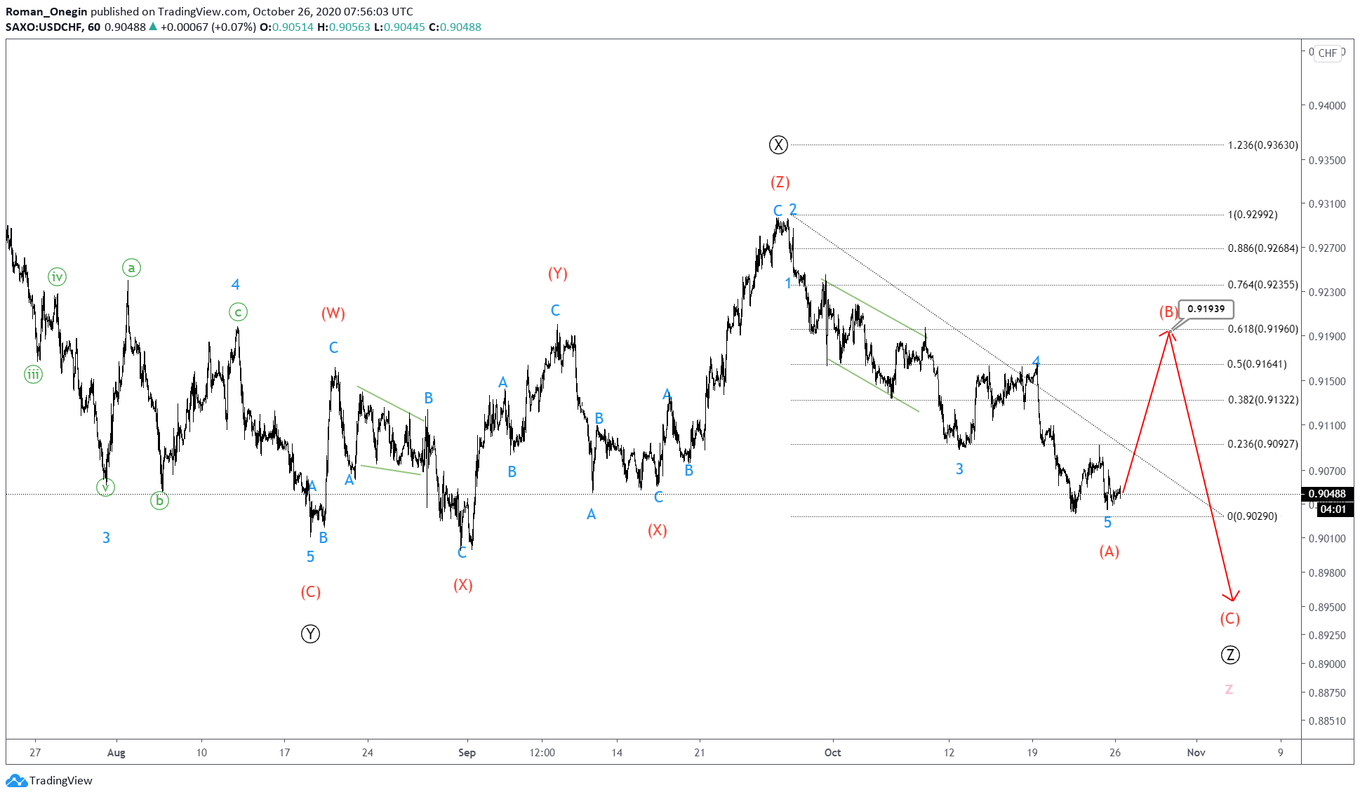 The 1-hour time frame shows the final wave Z of the cycle degree pattern which is also a triple zigzag. The primary degree pattern consists of sub-waves Ⓦ-Ⓧ-Ⓨ-Ⓧ-Ⓩ. We currently see the development of the last wave in this construction.