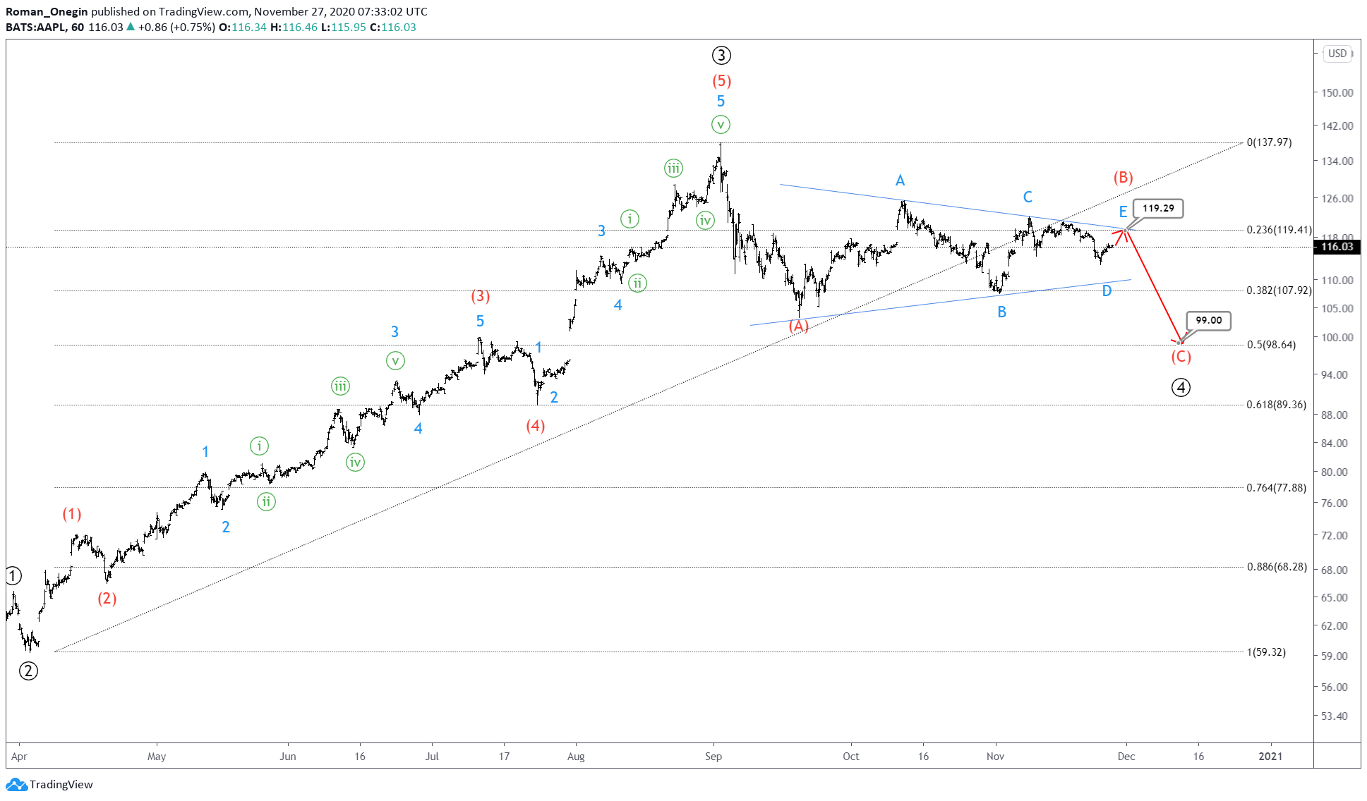 Wave (B) is a contracting triangle and is likely to end at the resistance line through the verticles A and B near 119.29.