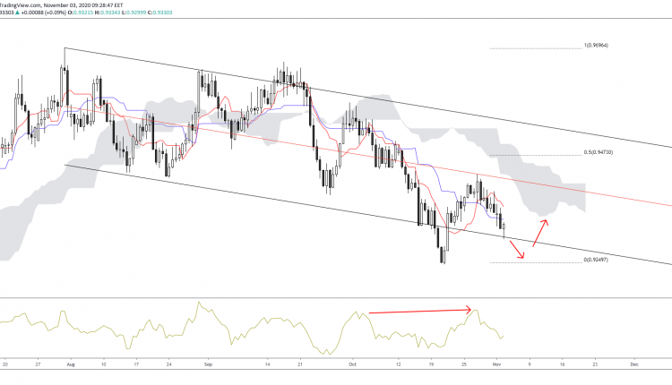 The hidden divergence on the momentum indicator hints at prices falling further. A potential bounce at the low of the 0.9696/0.9249 downside Fibonacci leg could lead to another attempt towards the lower border of the Ichimoku cloud.