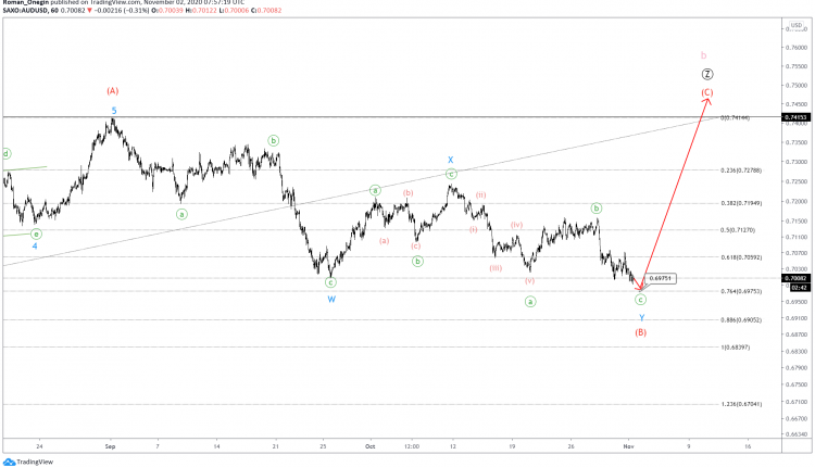 The current AUDUSD structure hints at a corrective wave b. This takes the form of a triple zigzag, as the final primary wave Ⓩ is currently under development