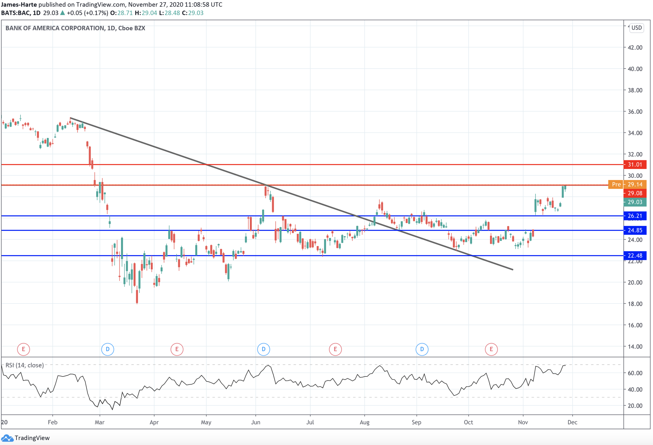 Shares in Bank of America are trading a little higher pre-market on Friday. The company’s share price continues to extend its impressive rally off the October lows. BAC has benefitted sharply from the broad upturn in risk assets sparked by the recent COVID vaccine news. Shares are now set to break out to their highest levels since March 2020, the height of the pandemic.
