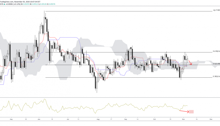 However, a look at the momentum indicator hints at a hidden bearish divergence. This could lead prices back down to the lower channel level and begin the engulfment of the cloud.