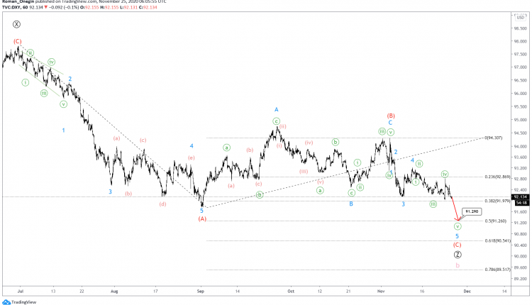 The final wave Ⓩ is an intermediate (A)-(B)-(C) zigzag. Where wave (A) is an impulse, wave (B) is a flat, and wave (C) is an incomplete impulse. The minor wave 5, takes the form of an ending diagonal of the minute degree.