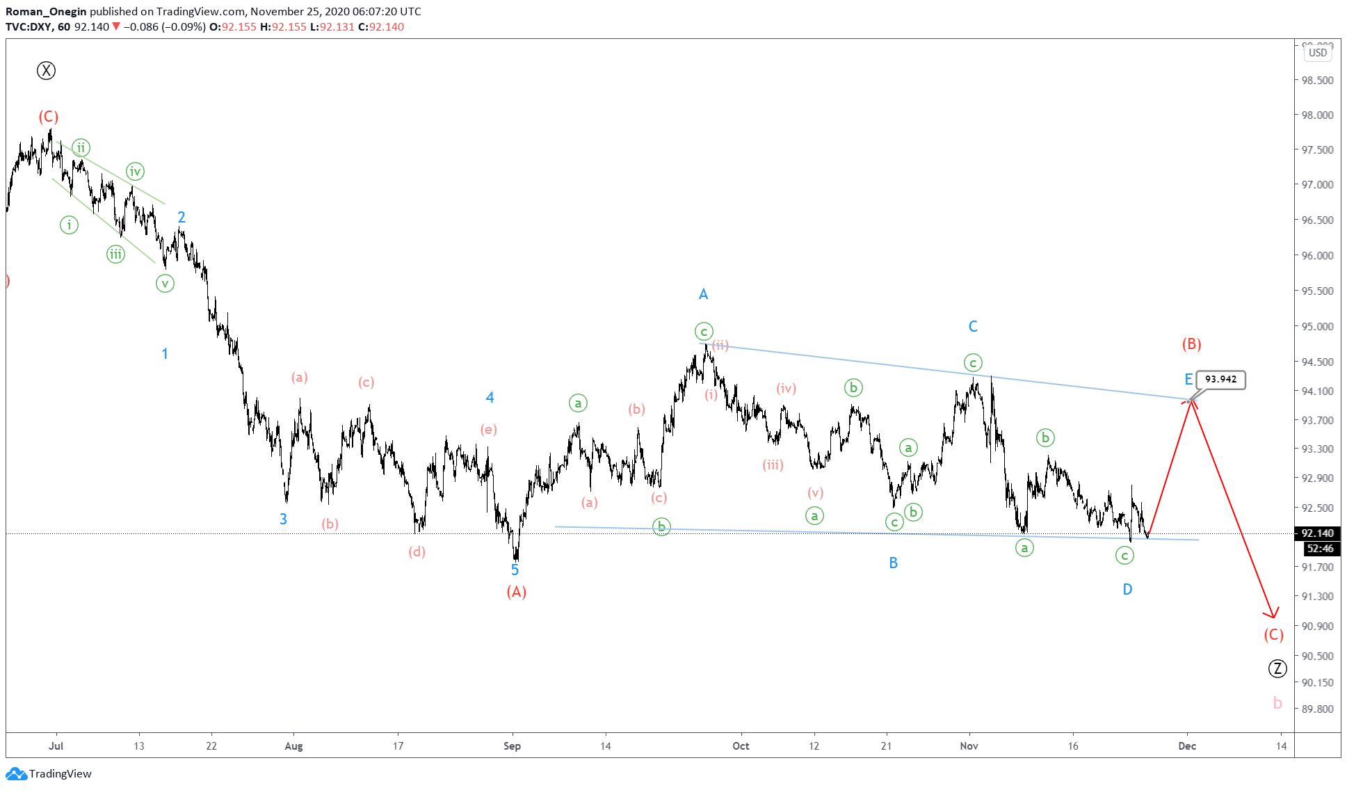 The 1hr timeframe of the DXY index shows the final of the cycle degree correction b.