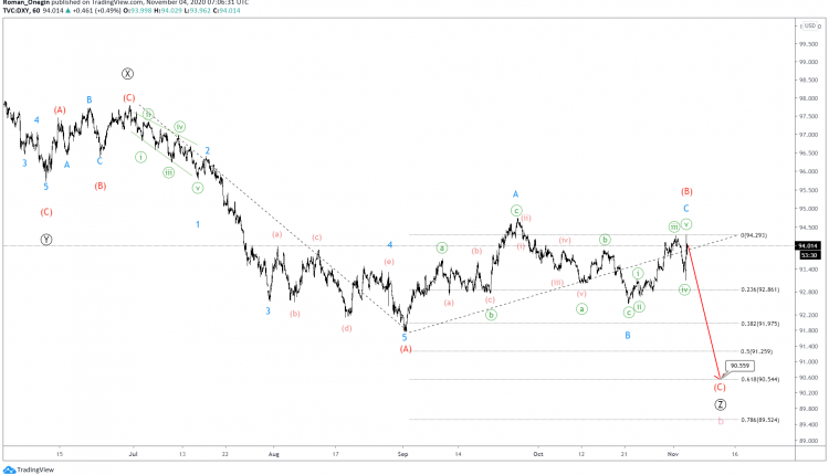 The DXY structure shows a bearish triple Ⓦ-Ⓧ-Ⓨ-Ⓧ-Ⓩ zigzag, which forms a cycle corrective wave b.