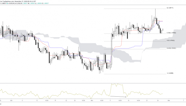 A shorter-term outlook on the currency pair shows that the bias is currently on the upside. A bounce at the recent lows has propelled prices, with the lower border of the Ichimoku cloud being the next target.