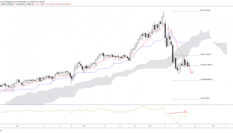A short-term perspective shows that the bias remains on the downside. Another hidden divergence that might emerge could push prices slightly higher. This could confirm another test at the €9.00 psychological support.