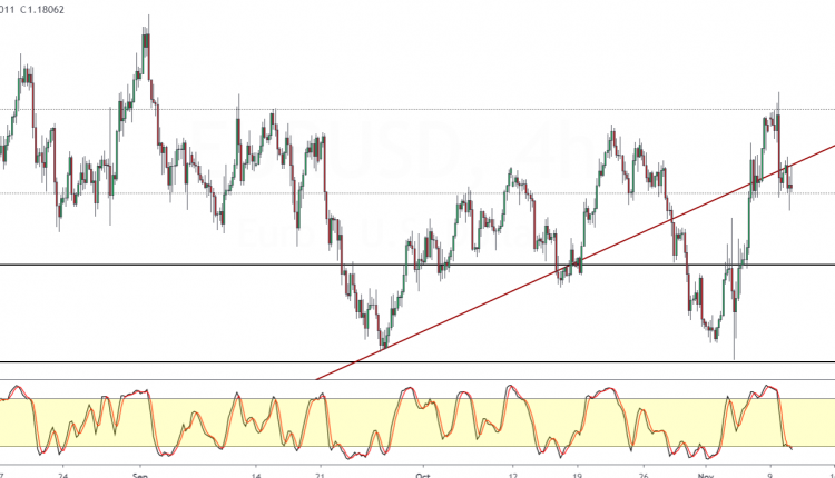 At the time of writing, the common currency is trading near the 1.1800 level. With the trend line and the horizontal support area, price action could be moving into a tight consolidation.