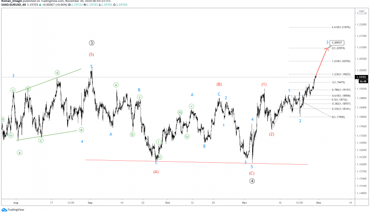 The EURUSD structure shows a bullish impulse consisting of primary sub-waves ①-②-③-④-⑤.