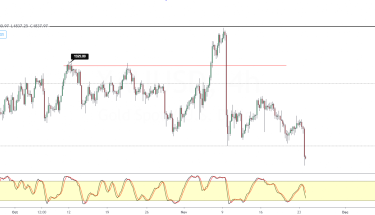 With the 1850 handle breached, the precious metal is likely to extend declines down to the 1800 level next.