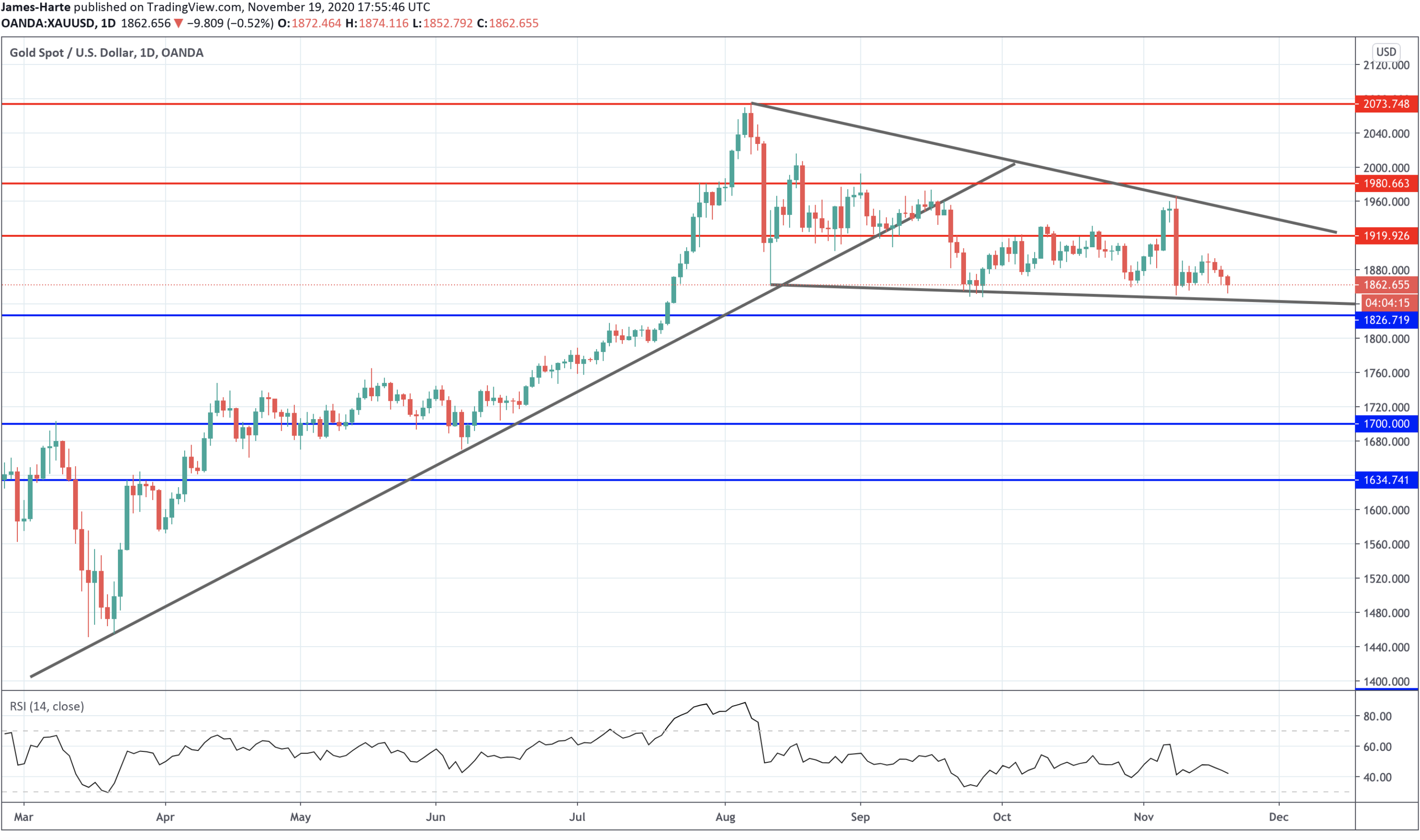 Following the reversal lower from the 2073.74 level and the breakdown through the rising trend line from 2020 lows, price continues to trade lower within a falling wedge pattern.
