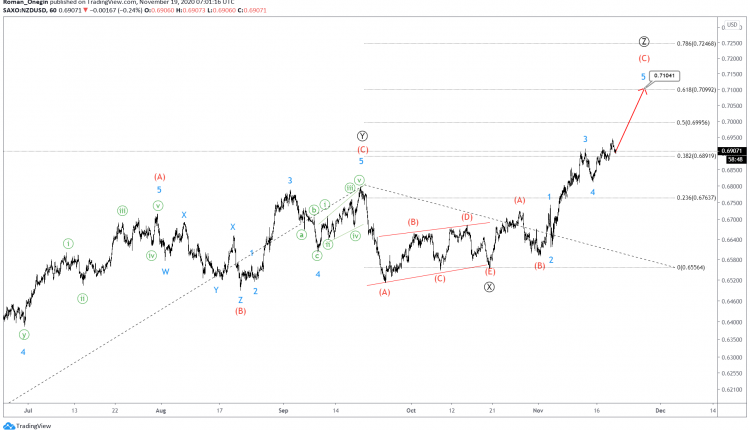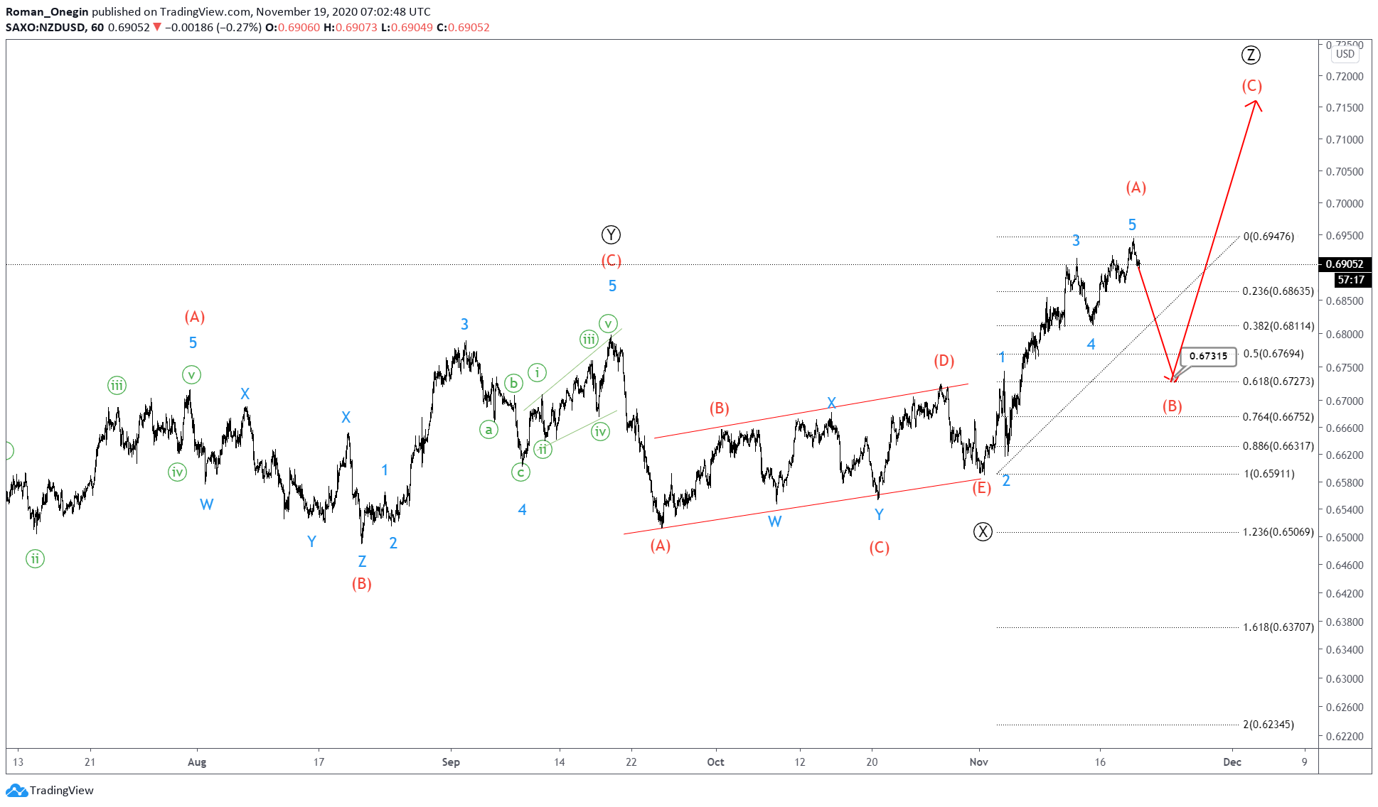 The current NZDUSD structure shows the formation of the final leg of the primary triple zigzag Ⓦ-Ⓧ-Ⓨ-Ⓧ-Ⓩ.