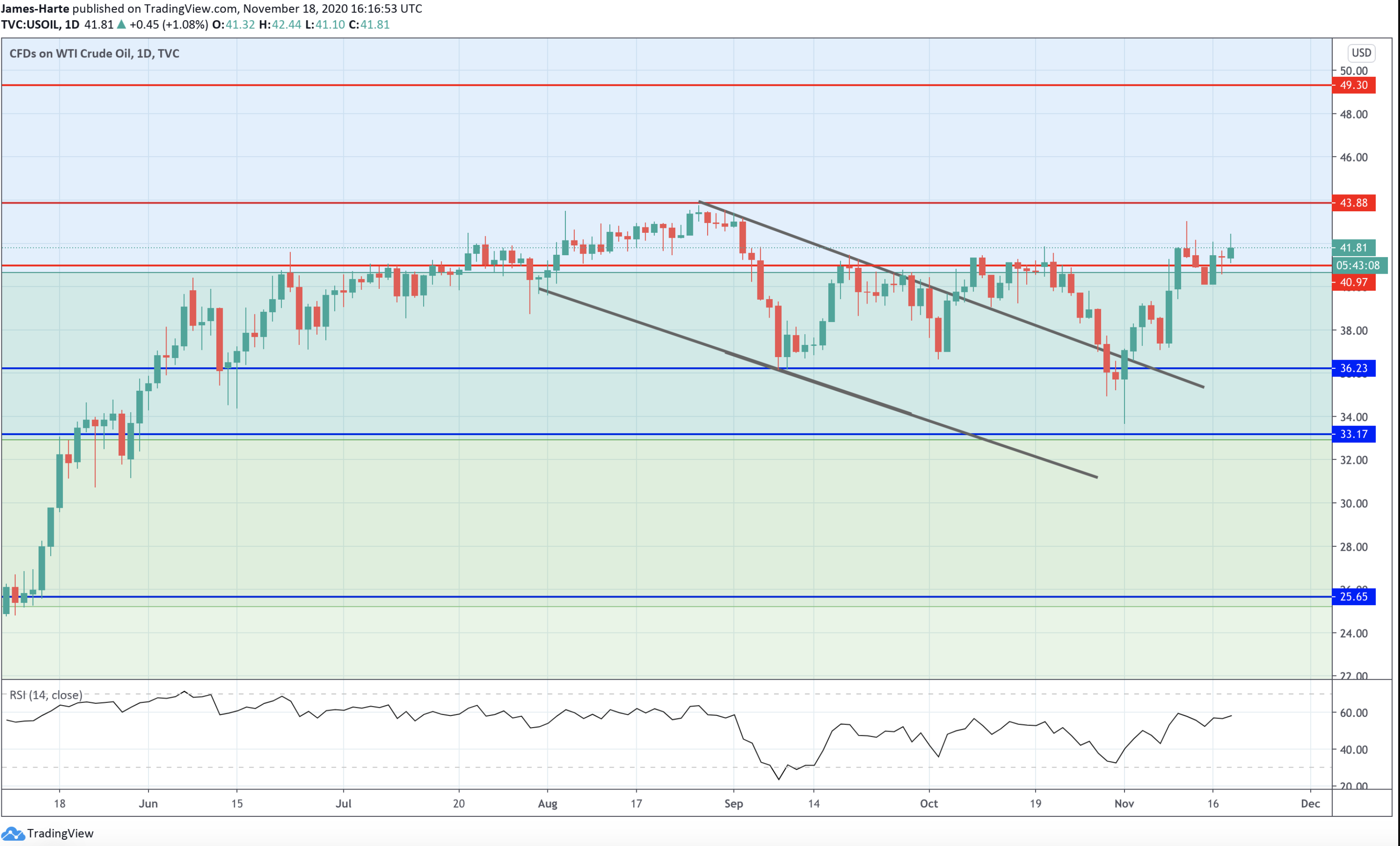 While above here, the focus is on further upside with the 43.88 level the next upside zone to note. To the downside, any correction below the 40.97 level will turn the focus back to the 36.23 level support and the retest of the broken channel.