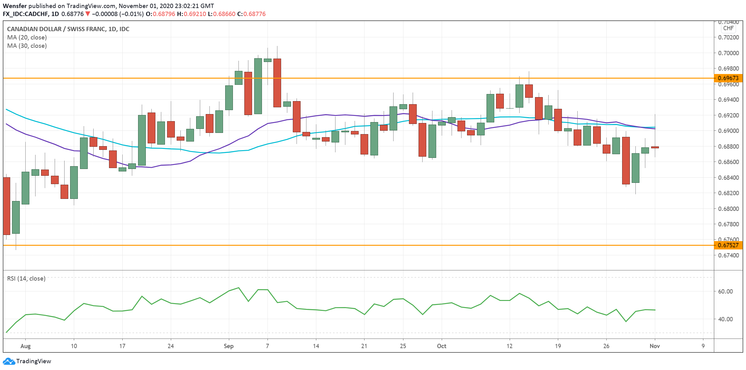The pair has dropped below the recent trading range of 0.6850-0.7000. 0.6750 from last July is the immediate target and a bearish breakout could send the price towards 0.6600.