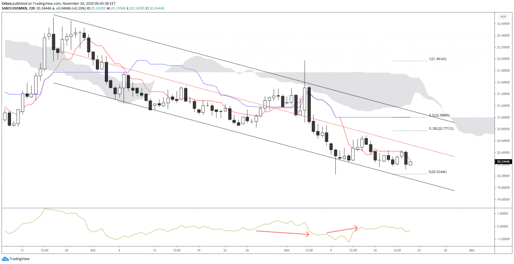 USDMXN has seen a bearish move from its attempt to move over $23 in September. The currency pair hit a double resistance which has now led prices trading inside a descending channel.