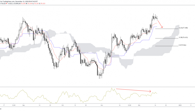 Prices now look to wane as the 23.6% of the 73.15/78.79 upside Fibonacci leg eyes the first target. Should this level be achieved, then another test at the 38.2% could come into fruition, with the upper border of the Ickimoku cloud being a confluence zone.