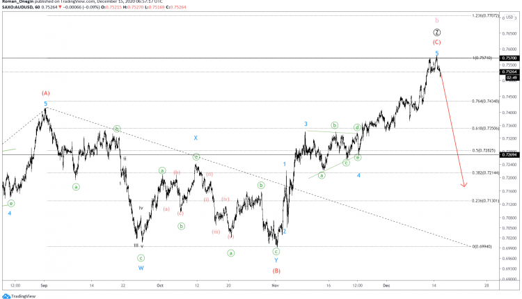 The current AUDUSD structure hints that the primary triple zigzag cycle wave b has completed.