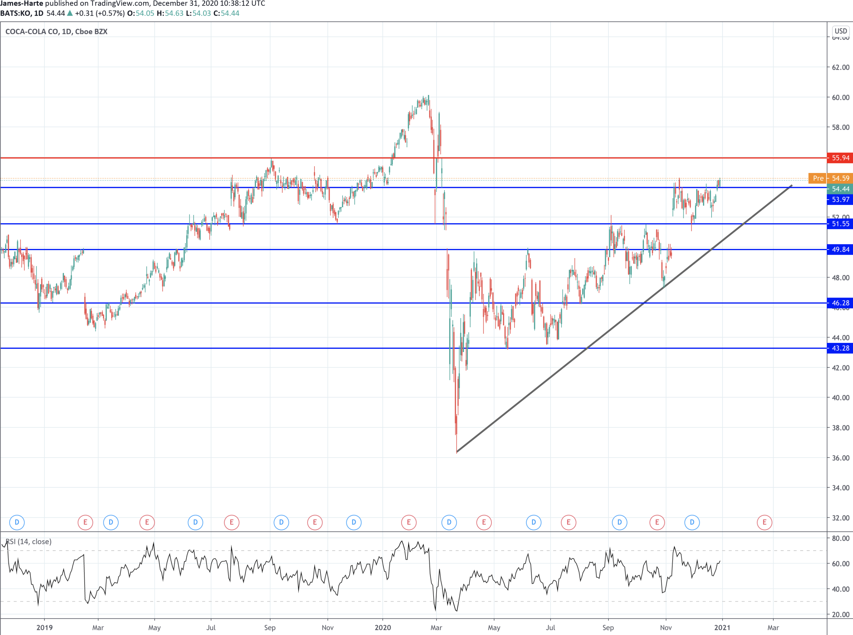 Shares in Coca-Cola are continuing to push higher here. Following the gap higher at the start of November, shares have been capped by the 53.97 level. Now, they sit atop the level.