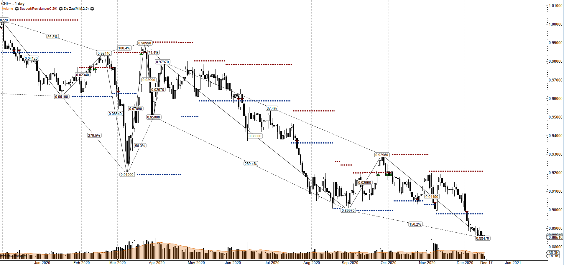 Dopo il “boost” di inizio novembre con test sulla resistenza da noi segnalata a 1.0864 di inizio dicembre, EURCHF arretra sensibilmente drenando la metà della precedente ascesa e stabilizzando le quotazioni a 1.073, intercettato dal riferimento regressivo pari a 2 STDV rispetto alla retta di regressione in essere dall’inizio di luglio. La situazione al momento resta a moderata positività, ma non sono da escludere delle scivolate sotto quota 1.075 per test in area 1.071, dove staziona un fortissimo supporto desunto dalla volatilità. Importante, in funzione futura, il recupero di quota 1.087. Dal lato “acquisti” un eventuale recupero di 1.087 aprirebbe le possibilità per recuperi fino a 1.092, da raggiungere comunque in assenza di velocità e in modo piuttosto articolato nel rispetto della componente stagionale, letta sempre in chiave negativa. Nella sostanza, comunque, il cambio EURCHF sembra privo di spunti direzionali importanti.