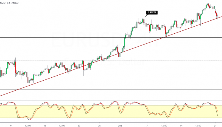 The euro is currently testing the trendline support and the 4 December highs of 1.2177.