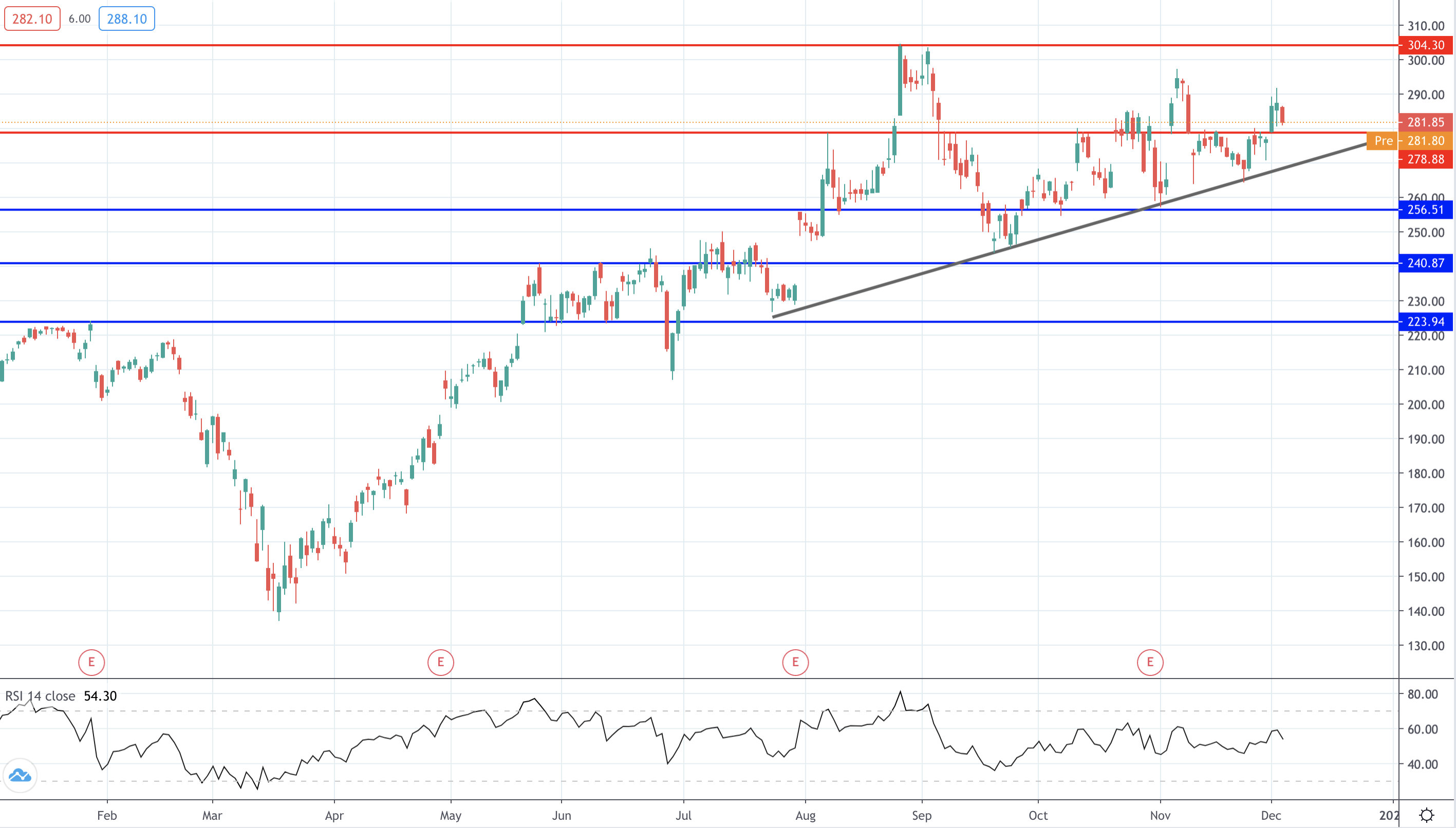 Should price break below the rising trend line, the next support level to watch will be the 256.51 level, with the 240.87 level coming in below. To the topside, 304.30 remains the key hurdle for bulls.